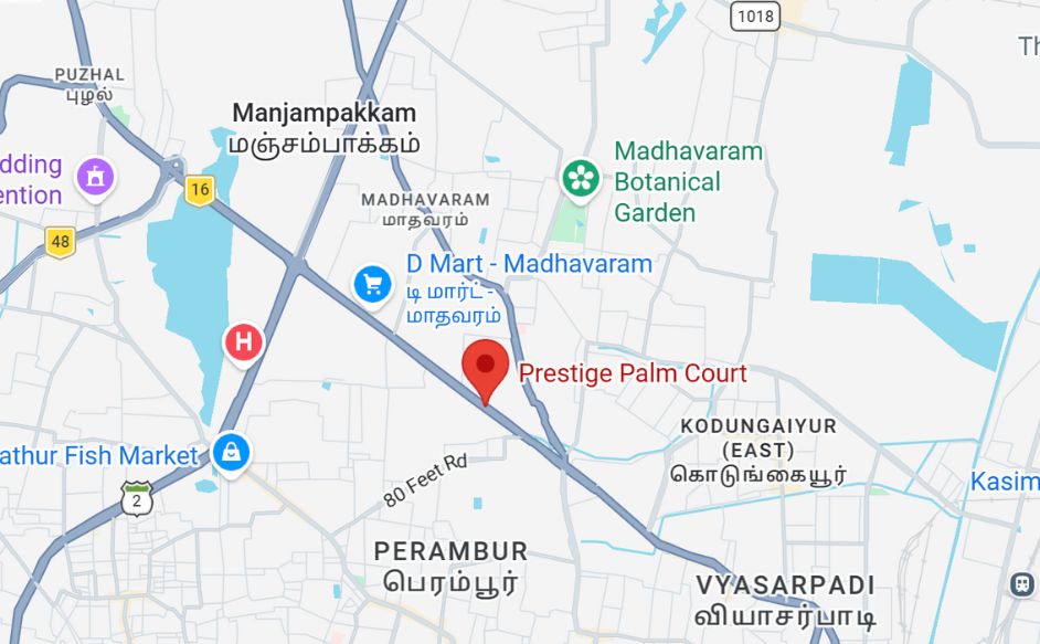 Prestige Palm Court is an exquisite pre-launch residential development by the Prestige Group, located in the rapidly evolving neighborhood of Madhavaram, Chennai. Spanning across a lush 8-acre premium land parcel, this project features over 900 thoughtfully designed apartments distributed across majestic towers rising up to G+20 floors. Offering a diverse range of 1, 2, and 3 BHK configurations, the residences are meticulously crafted with high Vaastu compliance to ensure positive energy and optimal space utilization. Residents will enjoy a sophisticated gated community lifestyle enriched with world-class amenities, including a swimming pool, clubhouse, jogging track, and specialized meditation pods. Strategically positioned just 10 minutes from the Madhavaram Metroline and 20 minutes from Chennai Central Railway Station, the project ensures effortless connectivity to the city's primary hubs. Proximity to reputed institutions like Sri Chaitanya School and healthcare facilities like KVT Multi-Speciality Hospital makes it an ideal choice for families. With a scheduled possession in December 2030, Prestige Palm Court presents a golden opportunity for homebuyers and investors seeking long-term appreciation and a serene, luxurious urban living experience in North Chennai.